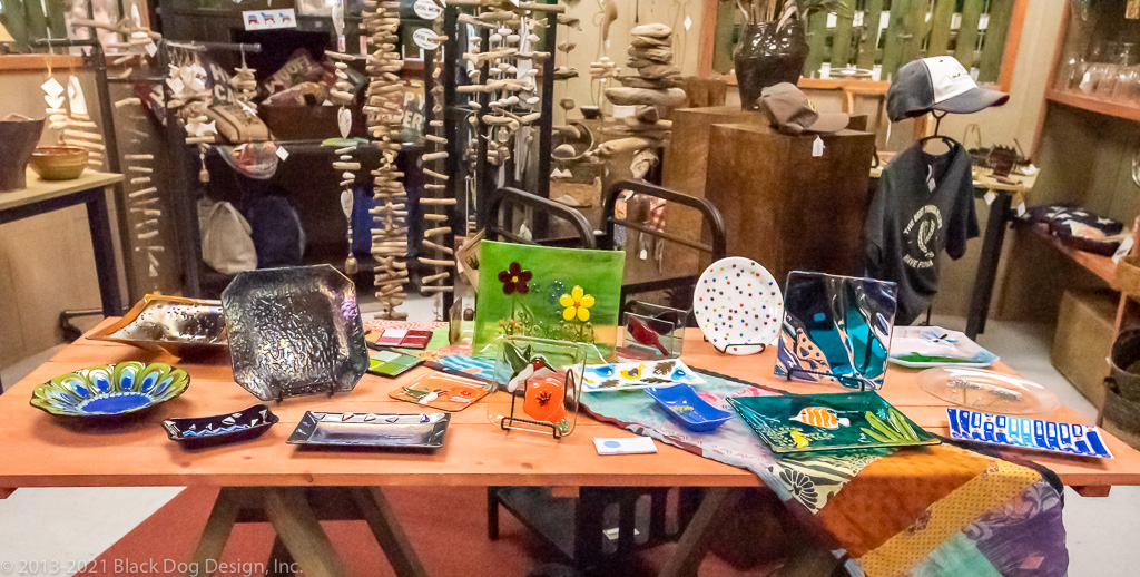 Many wonderful new items in the store, including stunning fused glass work and driftwood chimes.